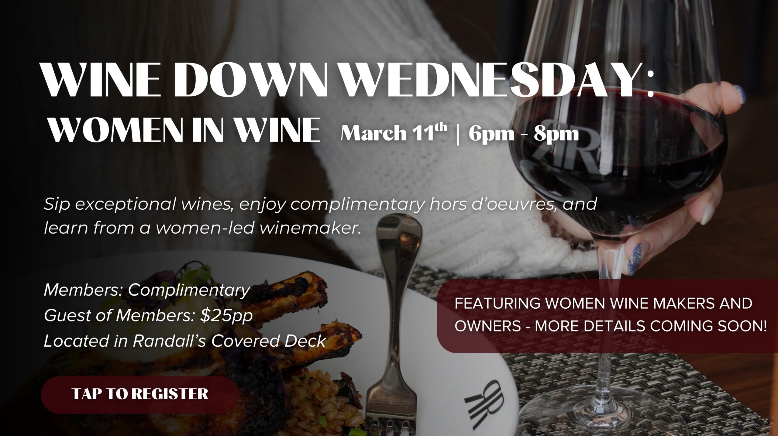 Join us for a special Wine Down Wednesday featuring women-led wine makers and owners. Enjoy an elevated evening of fine wines, light bites, and great company while learning more about the women shaping the global wine industry.